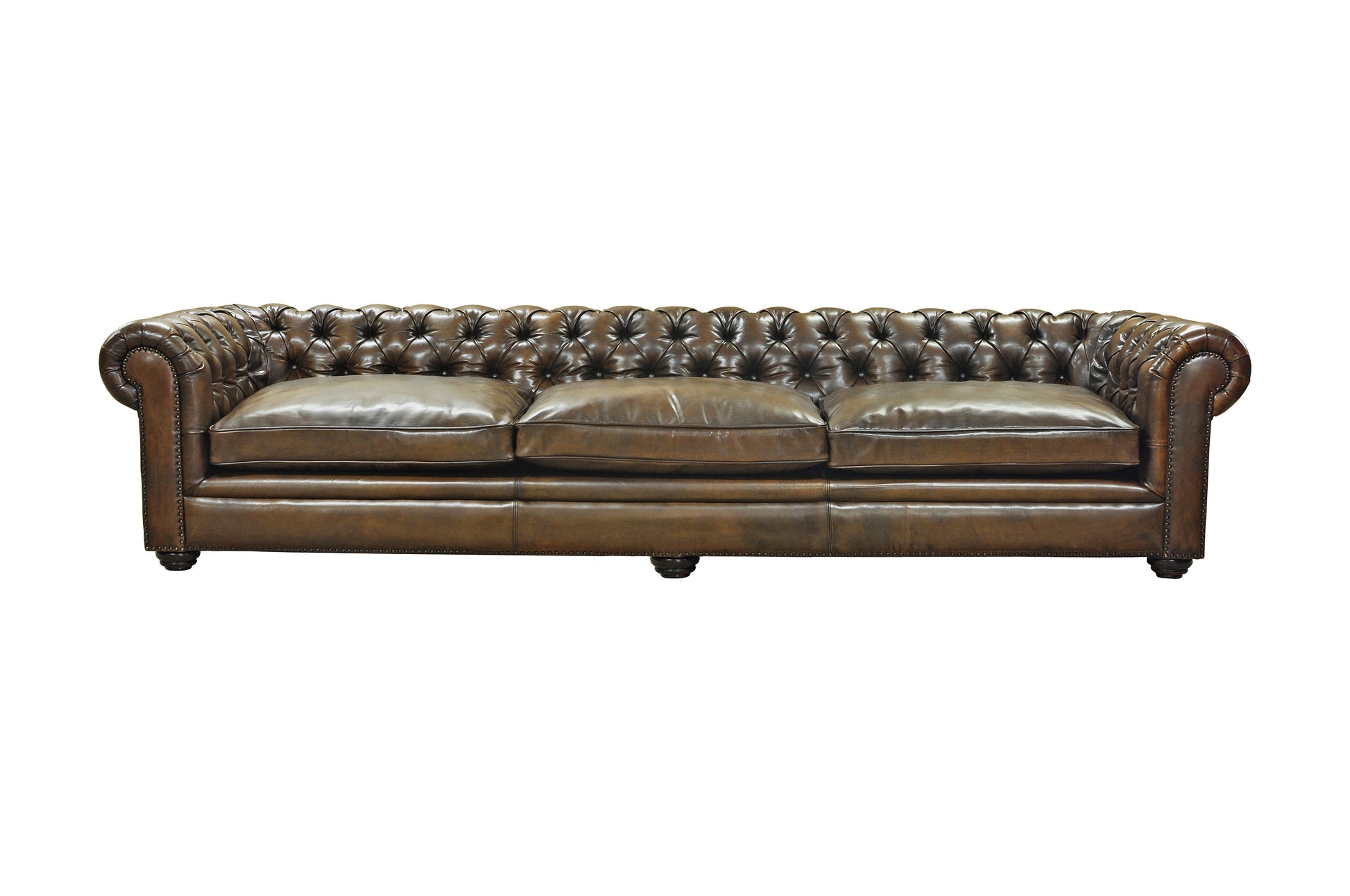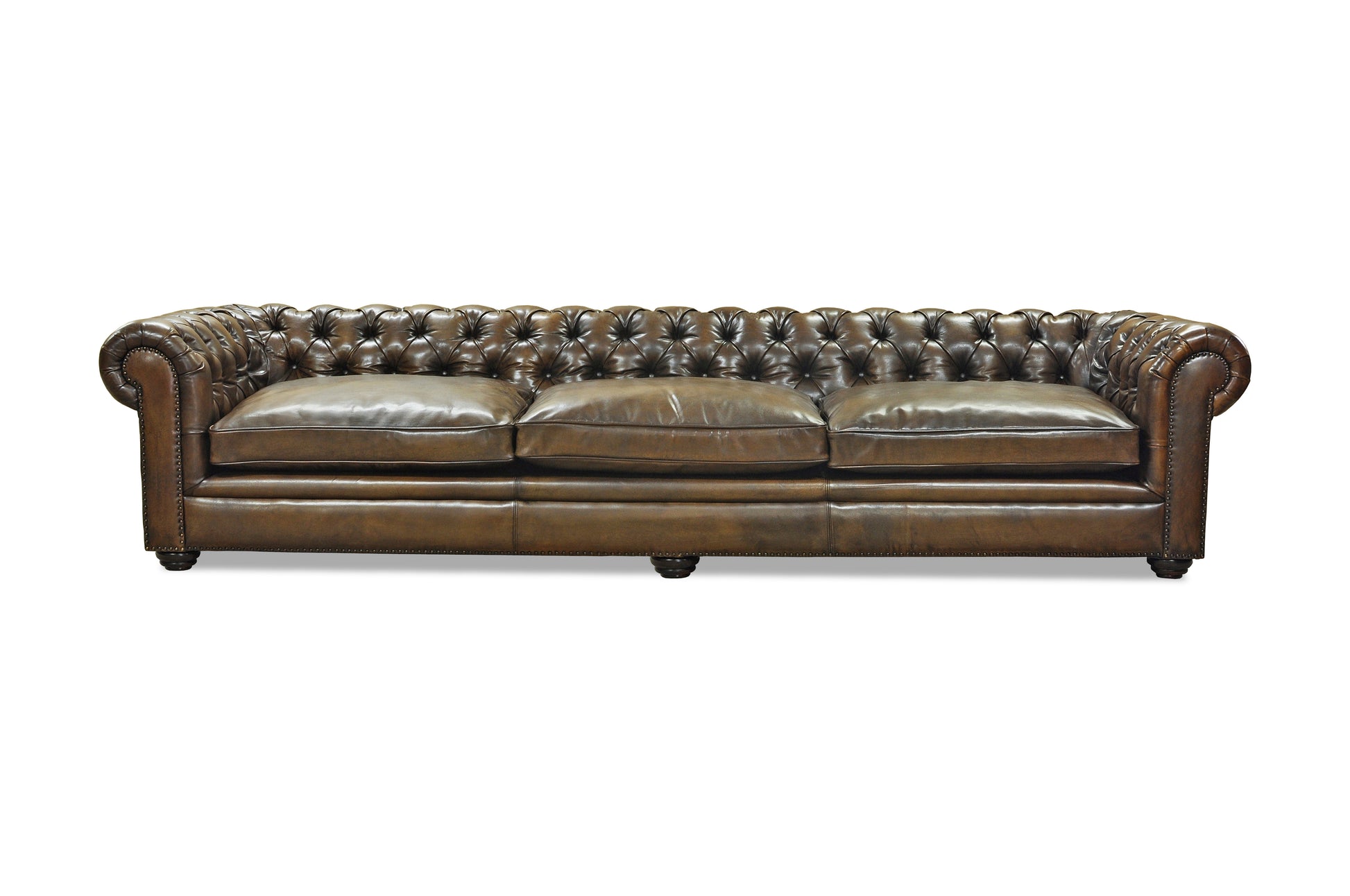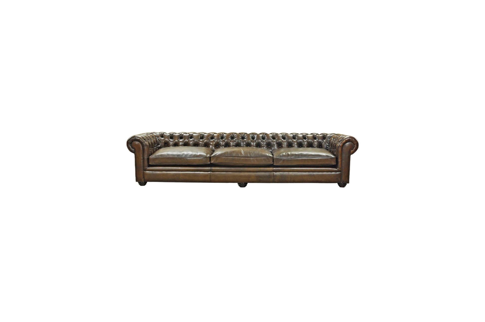 A celebration of heritage craftsmanship, this bespoke Chesterfield sofa is meticulously handcrafted and upholstered in rich, hand-finished leather. Featuring deep button tufting, sculpted rolled arms, and traditional nailhead detailing, it embodies timeless British elegance. Designed for connoisseurs of fine furniture, it offers enduring comfort, character, and understated prestige.