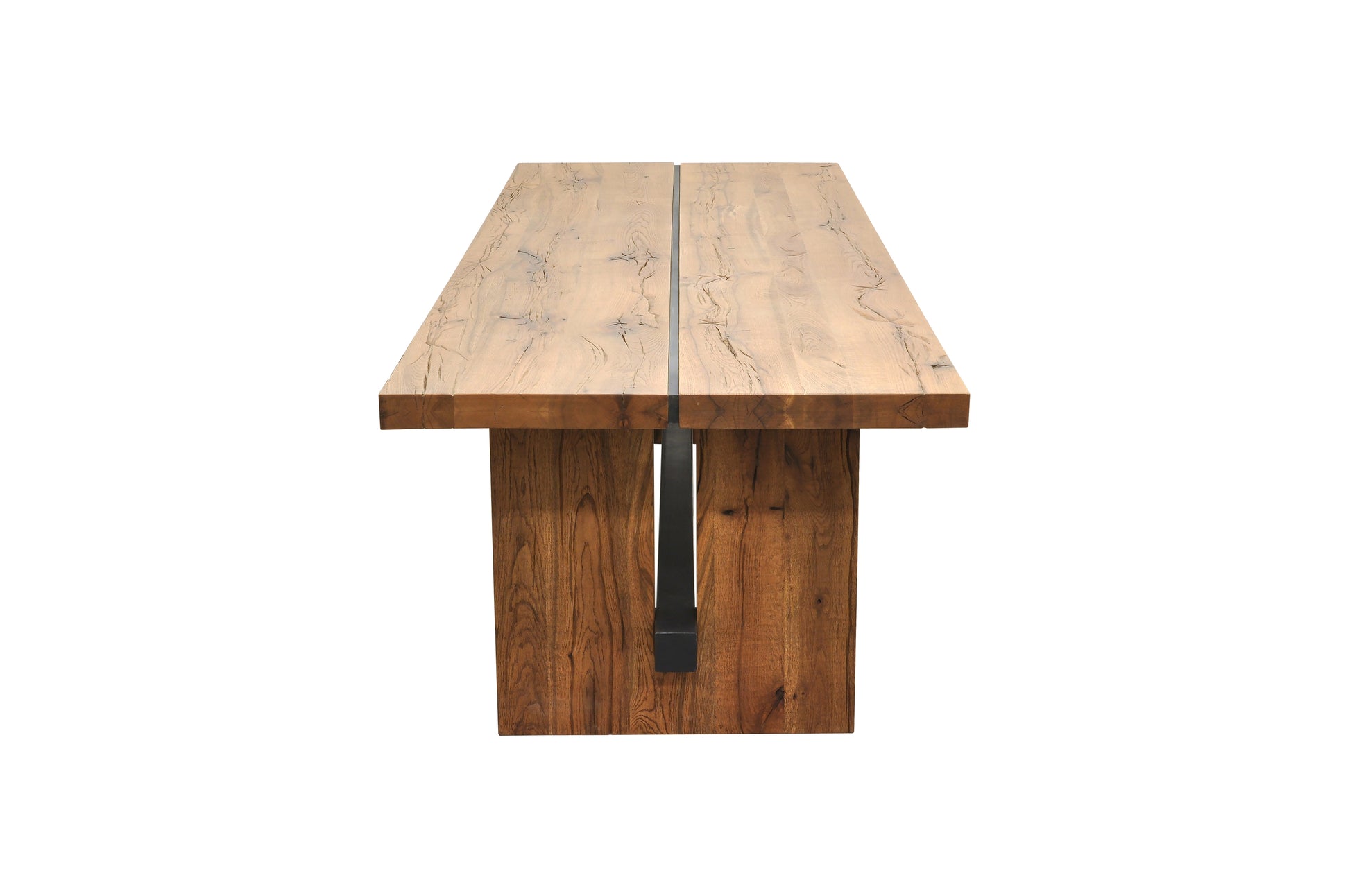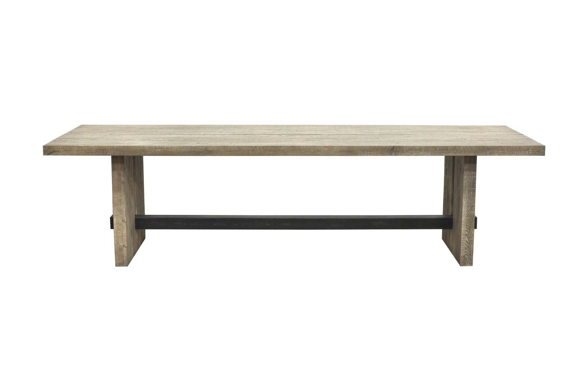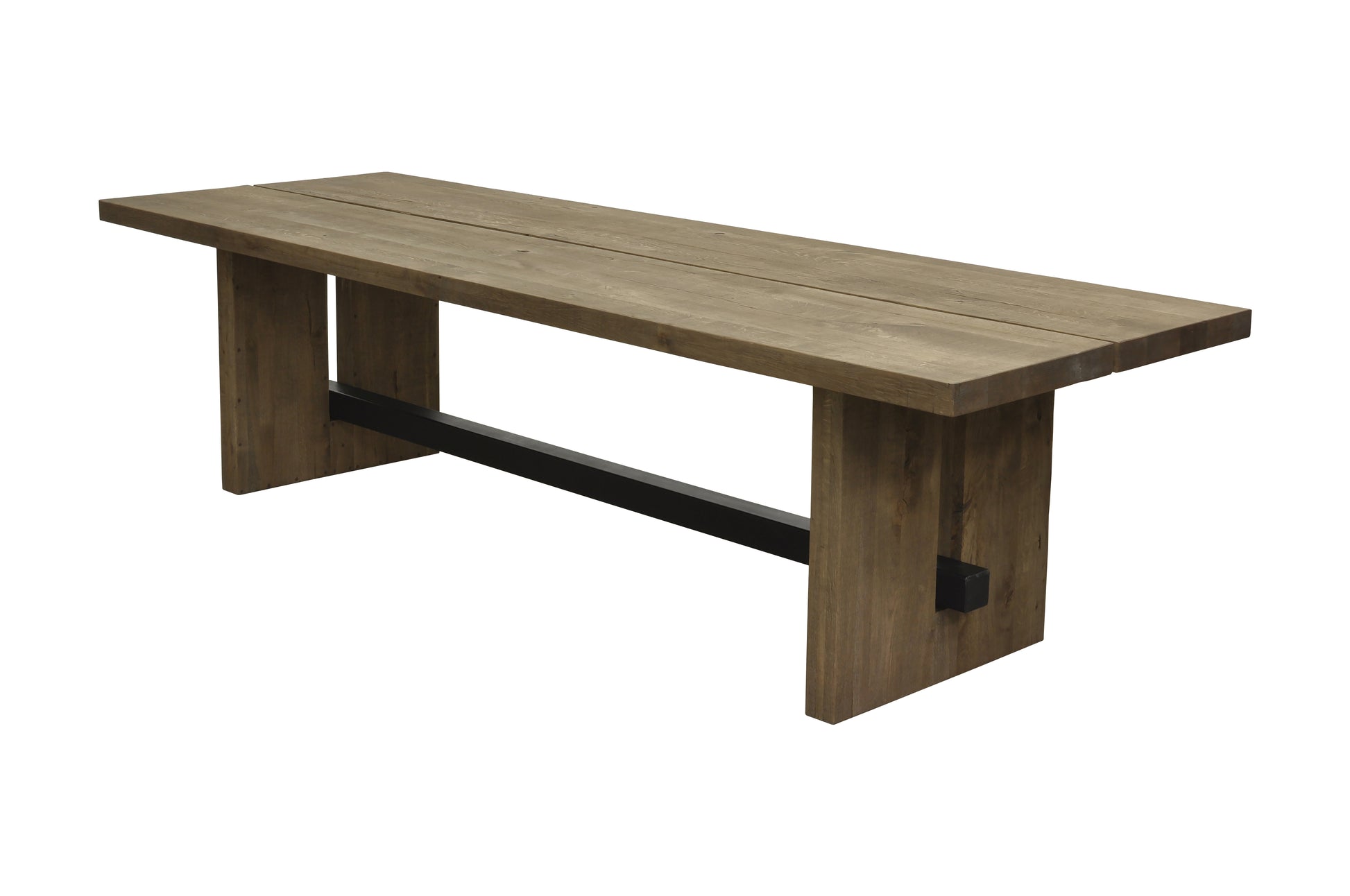 This rectangular dining table combines the warmth of solid wood with clean, modern lines for a bold yet timeless look. The thick wooden tabletop highlights the natural grain and character of the material, while the strong panel legs create a grounded, architectural presence. A sleek metal stretcher adds contrast and reinforcement, enhancing both stability and visual interest.
